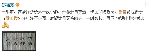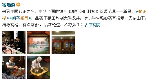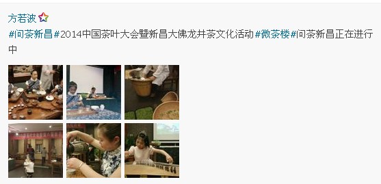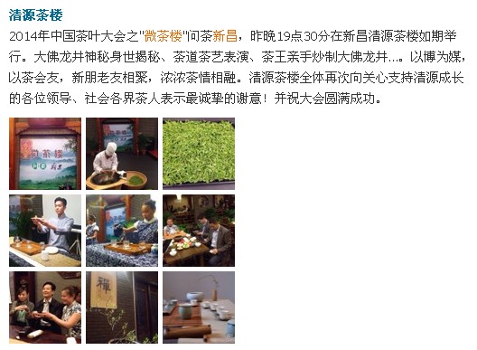 4月14日晚,2014年中国茶叶大会暨第八届新昌大佛龙井茶文化活动中的分活动——“微茶楼”问茶新昌活动在新昌清源茶楼举行。活动为大家揭秘了大佛龙井的神秘身世,并进行了茶道茶艺表演,上届茶王也亲临现场亲手炒制大佛龙井。新老朋友在茶楼内品茶会友,其乐融融。